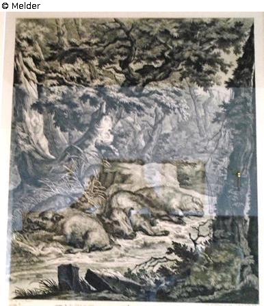 Auf einer sonnigen Waldlichtung vier liegend ruhende Wildschweine. Dahinter ein Wildschwein nach Eicheln am Baum schnappend. Dahinter knorrige Eiche. Darunter Wildschweinfährten.