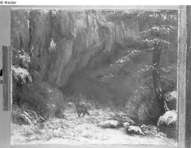 bezeichnet unten links: "G. Courbet". Vorder- und Rückseite seit 1943 durch Hitzeeinwirkung verschmort. Auf der Keilrahmen-Rückseite Reste von Etiketten, darunter auf dem Oberschenkel die rechte Hälfte eines Etiketts, bedruckt mit "(…) ANVERS".
