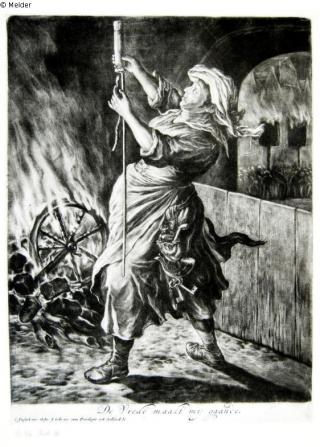 Fundmeldung Frau macht Feuer, aus: Die allgemeine Freude über die Belagerung von Namur De Vrede maaht my gaande Hersteller/Künstler:in Dusart, Cornelis Objektart Druckgrafik Material / TechnikPapier / gedruckt (Mezzotinto)Lost Art-ID601674