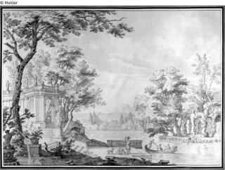 Fundmeldung Idealer Gartenprospekt mit Arkaden am Wasser Hersteller/Künstler:in Moucheron, Isaac de Objektart Zeichnung Material / Technikgezeichnet (Feder)Lost Art-ID220893