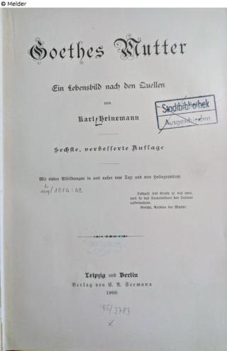 Fundmeldung Goethes Mutter. Ein Lebensbild nach den Quellen 6. Auflage Autor:in Karl Heinemann Verlag Seemann Objektart Buch Lost Art-ID634326