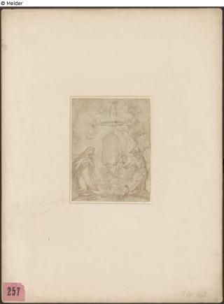 Fundmeldung Frau (Nonne?) links und Mönch rechts beten eine Figur an (die im Bild noch nicht ausgeführt ist) Hersteller/Künstler:in Herrera, Francisco (el Mozo) Objektart Zeichnung Material / TechnikPapier ; Sepia / gezeichnetLost Art-ID619371