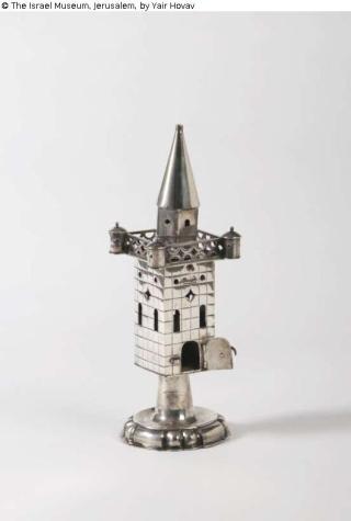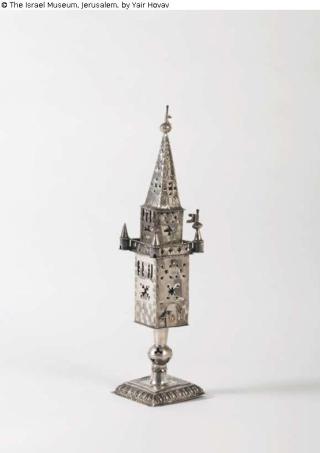 Fundmeldung Spicebox for Havdalah ceremony (?) with depictions of local scenes of houses and animals Objektart Behältnis Material / TechnikSilver / engraved and castLost Art-ID571573