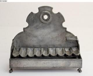 Fundmeldung Chanukka-Leuchter Hersteller/Künstler:in Maiziere, Johann Michael Objektart Beleuchtung Material / TechnikMetall (Zinn) / gegossen ; geflochten ; punziertLost Art-ID566400