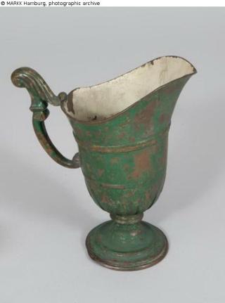 Fundmeldung Krug vermutlich zur Händewaschung Hersteller/Künstler:in Unbekannt Objektart Gefäß Material / TechnikMetall (Messing) ; Farbe / getrieben ; gegossen ; bemaltLost Art-ID626354