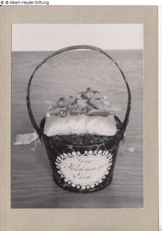 Suchmeldung Geschenk Verlobungs- oder Geburtsgeschenk "Das Körbchen der Liebe" Hersteller/Künstler:in Unbekannt Objektart Kunsthandwerk / -gewerbe Material / TechnikTextil ; Wachs ; HolzLost Art-ID629790