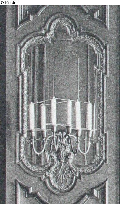 Dresdner Schloss, Nordflügel, 1. OG, Spiegelsaal; Im Inventarverzeichnis Nr. 1 vom 31.01.1920 als Bestandteil des Auseinandersetzungsvertrages des Freistaates Sachsen und dem vormaligen Königshaus von 1924 aufgeführt; Ein genauer Bergungstermin ist nicht aktenkundig, die Bergungsmaßnahmen wurden im Sommer 1944 beendet. Die Wandleuchter des Spiegelsaales wurde wahrscheinlich mit dem Transport vom 26.04.1944 nach dem Bergungsort Schloss Rammenau verbracht; Zu den Verlustumständen dieses Objektes ist nichts bekannt. Ein Verlust mit den Ereignissen im Zusammenhang des 2. WK wird vermutet.