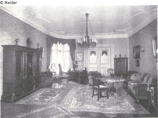 Herrenzimmer im Stil des englischen Barock; Eiche auf Mahagoni, poliert mit Maserholzfüllungen; Bibliothek, 2,30 m; Schreibtisch mit Auszügen; Sessel; achteckiger Tisch auf Wangenkonsolen(?), mit abnehmbarer Tischplatte und Spieltischeinrichtungen