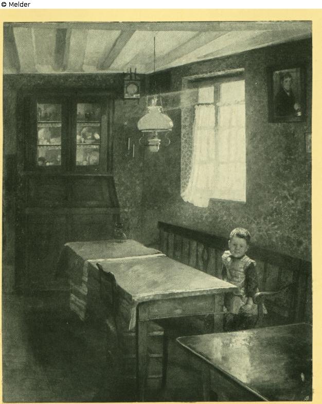 Tafelmalerei: Bild: Wohnzimmer, Besuchszimmer & auf einer Erhebung sitzen (weibliche Figur) : Mädchen (Kind zwischen Kleinkindalter und Jugend) & lächeln & Tisch & Möbel für die Aufbewahrung von Gegenständen & Gaslampe