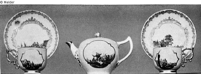 Lepke 1937b: Teekanne und fünf Tassen, gelber Fond mit ausgesparten passigen Feldern, reiche Goldspitzenbordüre und sehr feine farbige reich staffierte Prospektmalerei. Um 1740. (Drei Henkel gekittet.)