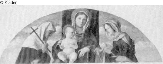 Tafelmalerei: Retabel: Maria sitzt oder thront, das Christuskind sitzt auf ihrem Knie & Madonna mit Heiligen & Katharina von Siena, Jungfrau und Bußschwester vom heiligen Dominikus; mögliche Attribute: Buch, Kreuz, Dornenkrone, Kruzifix, Dämon unter dem Fuß, Herz (mit Kreuz), Lilie, Pestkranke, Ring, Rosenkranz, Stigmata & Veronika; mögliche Attribute: Sudarium bzw. Schweißtuch (Schleier mit dem Bildnis Christi); Madonna; Christuskind; Knie; sitzen; links & Heiliger & Katharina von Siena (Heilige); Drittorden; Dominikaner; Lilie; Dornenkrone; Dämon; Herz; Pestseuche; Ring; Rosenkranz; Stigmata; Buch; Kreuz; Kruzifix & Veronika (Heilige); Sudarium; Schleier; Christus; Bild; Bildnis; Lünette