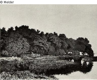 Wald am See mit blühendem Hollunder und Doldengewächsen. Signiert. Goldener Rahmen.