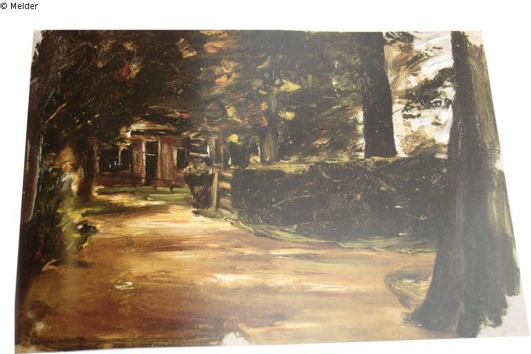 des Bildes wird ein Teil der Fassade des eingeschossigen Baus sichtbar. Der Bildausschnitt wird auf beiden Seiten von dicken Baumstämmen gerahmt. Rechts oben ein Stück des blauen Himmels, von wo das Sonnenlicht einfällt, das helle Flecken auf den braunen Boden malt. Der Ausschnitt gibt in kleinem Raum an- und abschwellende Lichter und Dunkelheiten, es entsteht der Eindruck von Ruhe und Harmonie zwischen Menschenwerk und Natur. Wir blicken auf ein modernes Paradiesgärtlein. [...] Das Gatter, das den Zugang zu diesem "hortus conclusus" öffnet, ist auf dem Gemälde erkennbar. Liebermann hat in dem Gemälde zugunsten einer intensiveren Naturstimmung auf die Einfügung von Figuren verzichtet."