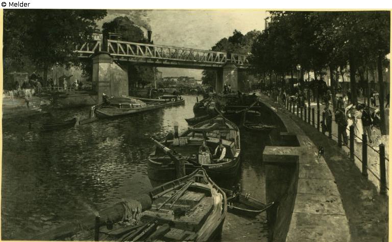 Tafelmalerei: Bild: Kanäle, Gewässer (in der Stadt) & Kai & öffentliche Straße & Kanal & Flußufer & menschliche Tätigkeiten im Sommer (bei der Einteilung des Jahres in vier Jahreszeiten) & abendliche Landschaft (manchmal benannt als: Vesper) & Brücke