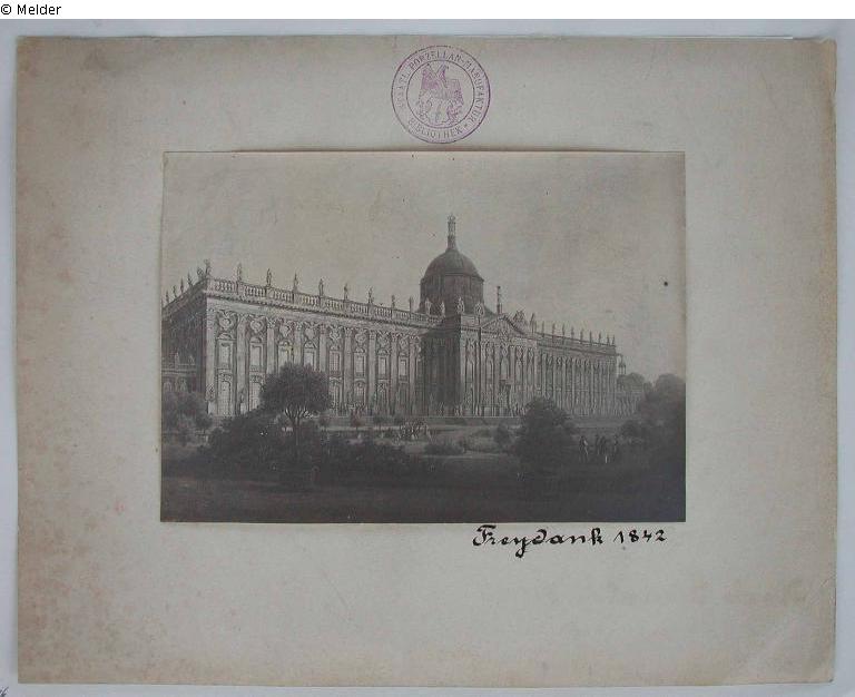 Suchmeldung | Einzelobjekt Ansicht des neuen Palais bei Potsdam von der Gartenseite Lost Art-ID439041 Vorherige Weiter Hersteller/Künstler:in Freydanck, Carl Daniel Geburt 1811.06.17, Berlin Tod 1887.11.26, Strausberg TitelAnsicht des neuen Palais bei Potsdam von der Gartenseite Datierung1842ObjektartMalereiObjektgruppeMalereiMaterial / TechnikÖl ; Leinwand / gemalt Höhe 27,00 cm Breite 36,00 cm InventarnummerNo 66Beschreibung Inventarnummer als Brandmarke auf dem Keilrahmen Weiterlesen Weniger anzeigen Provenienz Historischer Bestand KPM Berlin laut Inventareintrag des Gemäldeverzeichnisses der Manufaktur Weiterlesen Weniger anzeigen Veröffentlicht seit18.08.2011 Kontakt Stiftung Preußische Schlösser und Gärten Berlin-Brandenburg KPM-Archiv (Land Berlin) Schloss Charlottenburg Spandauer Damm 22 14059 Berlin Deutschland Homepagehttp://www.spsg.de Ansprechpartner:in Eva WollschlägerPositionKustodin Abteilung Schlösser und SammlungenTel+49 (0) 30 32 0 91-429E-Maile.wollschlaeger@spsg.de
