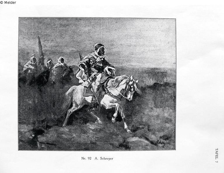 Suchmeldung | Einzelobjekt Araber auf einem weißen Pferd gefolgt von mehreren Berittenen Lost Art-ID319423 Vorherige Weiter Hersteller/Künstler:in Schreyer, Adolf Geburt 1828.07.09, Frankfurt (Main) Tod 1899.07.29, Cronberg (Taunus) TitelAraber auf einem weißen Pferd gefolgt von mehreren BerittenenObjektartMalereiObjektgruppeMalereiMaterial / TechnikÖl ; Leinwand / gemalt Höhe 54,50 cm Breite 65,00 cm Beschreibung Angreifende Beduinen, Beduinenzug nach rechts hinüberreitend, geführt von einem Scheich auf einem geschirrten Schimmel.Bezeichnet: A. Schreyer. Weiterlesen Weniger anzeigen Provenienz Versteigerungen:Leo Spik, Berlin 16.-17.9.1935, Nr. 92, Abbildung Tafel 7.Lempertz Köln, 12.-14.12.1935, Nr. 127.Graupe, Berlin 23.-25.03.1936, Nr. 106 Weiterlesen Weniger anzeigen Veröffentlicht seit2006 Ansprechpartner:in von Trott zu Solz LammekPositionRechtsanwälte NotarTel+49 (0) 30 59 00 33 0-0E-Mailkanzlei@vontrott-lammek.de