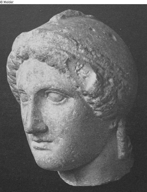 des Helmbusches und Bohrlöcher, vielleicht zum Befestigen des metallenen Helmbusches. Ergänzt Nase und Kinn.