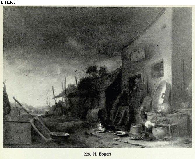 Links Stallgebäude; die Front mit vielem Gerät verstellt, Krüge, Wannen, Zuber, Kessel u. dgl. In der Tür ein Bauer, auf dem Hof liegt ein Hund. Abendstimmung. Goldrahmen, signiert