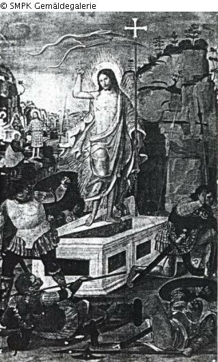 Tafelmalerei: Bild: Auferstehung: Christus steht auf oder neben dem Grab; stehen