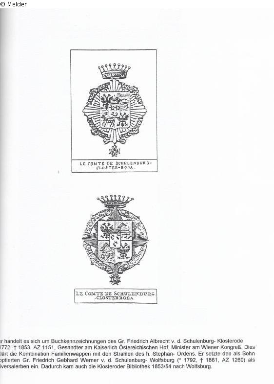 Familie Graf von der Schulenburg, vor 1942 Schloss Wolfsburg (bis 1932 Landkreis Gardelegen, Provinz Sachsen; danach Landkreis Gifhorn, Provinz Hannover; heute Stadt Wolfsburg); danach verbracht in das neuerbaute Schloss Neumühle bei Tangeln, Gemeinde Beetzendorf im Altmarkkreis Salzwedel.