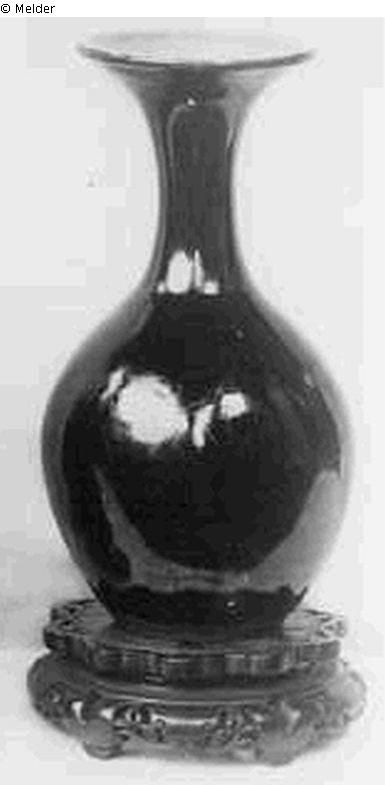 bauchige kleine Vase mit engem, an der Mündung stark erweitertem Hals. Porzellan, außen schwarz glasiert.