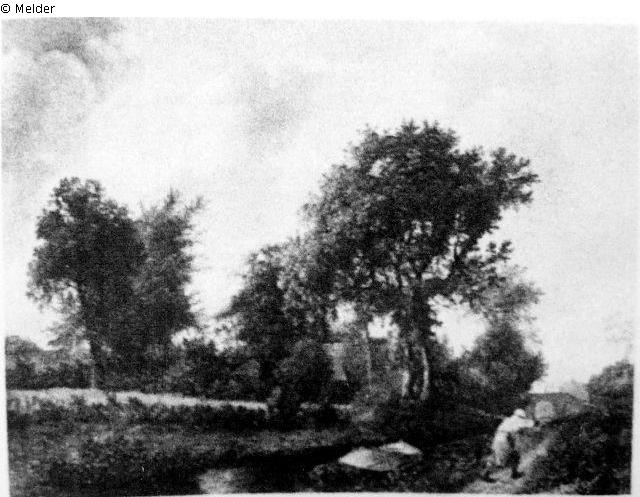 An einem von links her schräg in die Bildtiefe laufenden Kanal ein von hohen Bäumen umgebenes Bauerngehöft. Links ein sonnenbeschienenes Kornfeld. Dahinter ein zweites Gehöft. Im Vordergrund auf dem Treidelsteg ein Schiffer, der seinen hochbeladenen Kahn vorwärts stößt. Rückwärts auf einer Steinbrücke zwei Figuren in Unterhaltung. Heller Nachmittagshimmel mit einzelnen Cumuluswolken.