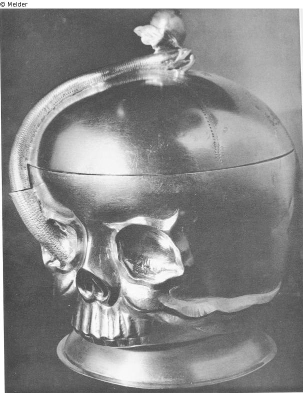 Becher aus unvergoldetem Silber in Form eines Totenkopfes, um den sich eine Schlange legt. Diese hält im Maul einen Apfel als Deckelknauf. Beitrag zum Vergänglichkeitssymbolismus des Barock. Graviert die Inschrift: Dedekindisches Ahndänkken der Stärblichkeit. 1714. / Gestern galts mihr heute gilts dihr. Aus dem Besitz der Kramer-Innung. Gemarkt mit Dresdner Beschau, der Zahl 12 und einer Meistermarke.