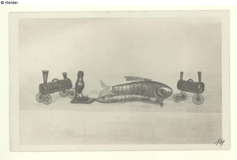 (Eintrag im Inventarbuch des Jüdischen Museums Wien vor 1938) Gewürzbüchse in Form einer Lokomotive, der Korpus wird von vier Rädern getragen.