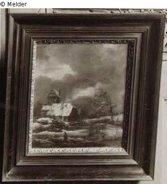vor einem schwarzgrauen Himmel mit großen jagenden Wolken steht links ein Gehöft mit einem Turm, vor dem sich beschneite Wege halb getaut hinziehen, auf denen ein paar Menschen einhergehen, rechts am Wege ein Baum vom Sturm gebeugt; bez. unten links „Ruisdael“