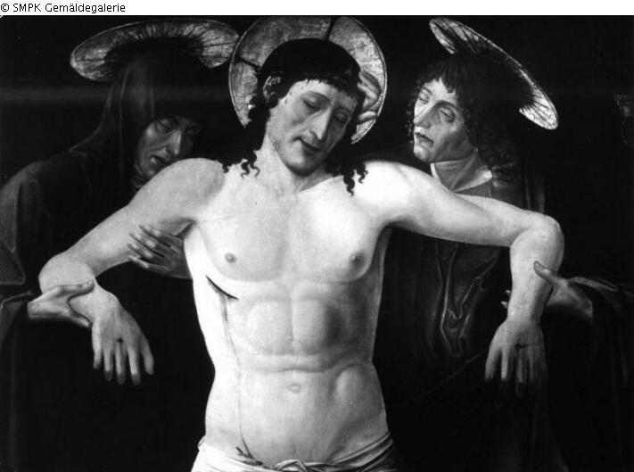 Tafelmalerei: Bild: der Leichnam Christi wird von Maria (im Beisein anderer Personen) gestützt & Johannnes der Täufer; mögliche Attribute: Buch, Schilfkreuz, Taufgefäß, Honigwabe, Lamm, Stab; Maria (Jungfrau) & Johannes der Täufer (Heiliger); Schale; Becher; Honigwabe; Lamm; Stecken; Stab; Taufschale; Schilf(gras); Kreuz; Buch