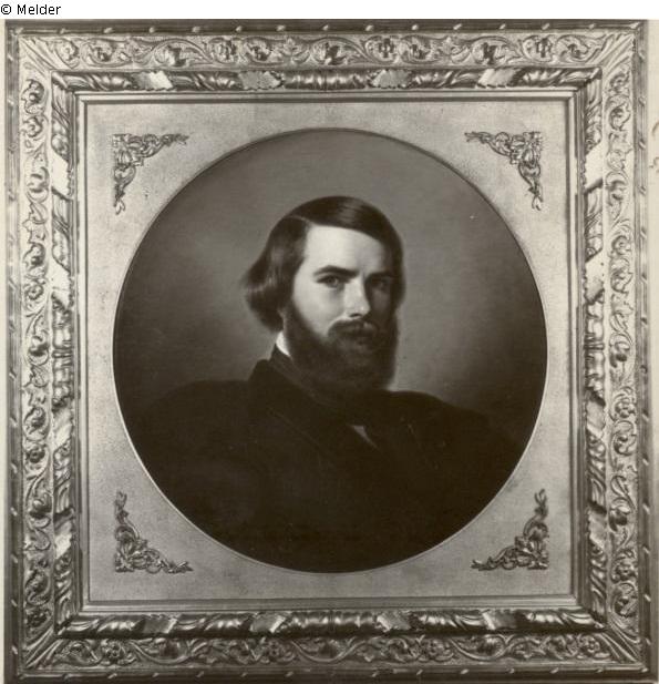Schulterbild; Schiefgescheiteltes Haar und Vollbart, schwarze Samtjacke mit Verschnürung, schwarze Seidenhalsbinde in deren Enden durch Kettchen verbundene Nadeln gesteckt sind
