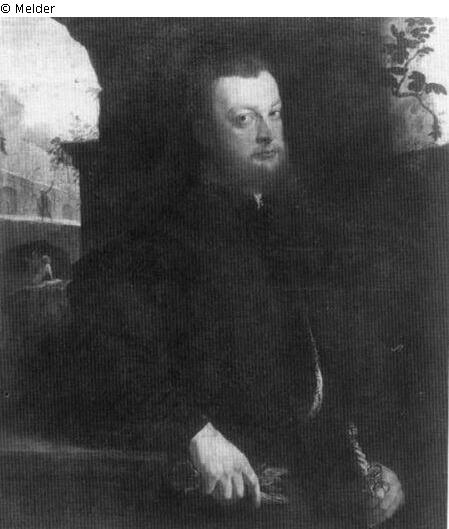 Tafelmalerei: Bild: Porträt einer anonymen historischen Person (allein) & erwachsener Mann & Prospekt einer Stadt, Stadtpanorama, Silhouette einer Stadt; Porträt; historische Person (anonym); männlich; historische Person & Erwachsenenalter & Panorama; Silhouette; Signatur: Links unten: AETATIS.23.A.153(6); Maße: 106 x 88 cm