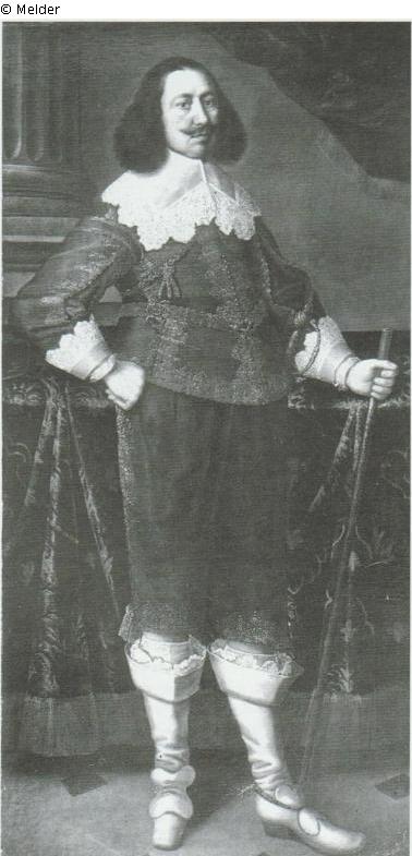 in rotbrauner, reich mit Goldstickerei besetzter Kleidung und breitem Spitzenkragen, an den Ärmeln breite weisse Spitzenumschläge. Mit ähnlichen Spitzen sind die weiten rehlederfarbe¬nen Schlappstiefel geziert. Er trägt einen Degen und stützt die linke Hand auf einen Stab, die Rechte hält er in die Seite gestemmt. Der Kopf etwas nach rechts gewendet, mit geradeaus ge¬richtetem Blick, ist von dunklem, bis auf den Kragen herabfallenden Haar bedeckt. Ein dunkler Schnurr- und Knebelbart ziert das energische Antlitz. Auf der rechten Brust wird unter dem Spitzkragen eine an goldener Kette hängende, mit Edelsteinen besetzte ordenähnliche Dekoration sichtbar. Der Dargestellte steht vor einem Tische mit geblümter Decke, links im Hintergrunde ein Säulenschaft, rechts eine Draperie. Bez. angeblich: Joachim Sandrart 1650 (Die Bezeichnung konnte nicht mehr aufgefunden werden. In der Kopie des Kataloges von 1906 eines Exemplares in der Kunsthalle Karlsruhe ist handschriftlich korrigiert: "Bez, rechts in halber Höhe Sandrart 1639")