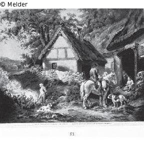 Bauerngehöft, rechts wird einem Reiter ein Trunk gereicht, links legt ein Junge Feuer an. Nach G. Morland. London, Colnaghi, Sala & Co. Gr.Qu.Folio.