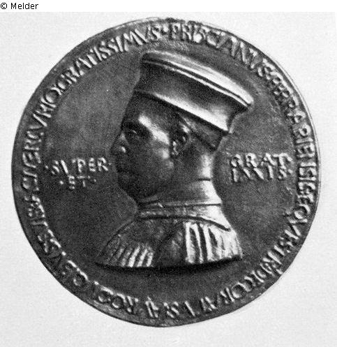 Große Bronzemedaille, Avers Revers die auf dem Rücken eines Vogels stehende Figur eines Mannes, einen Speer und eine Flamme in den Händen, Inschriften: PRISCIANUS - FERRARIENSIS - EQUESTER - DECORATUS - AORO - DUCIBUS - SUIS - ACMERCURIO - GRATISSIMUS -/A