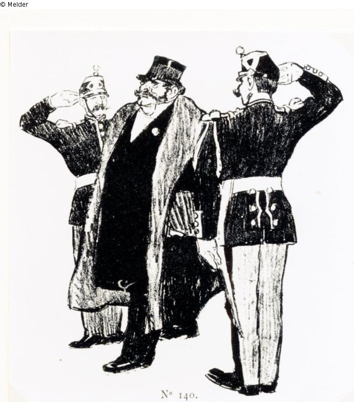 "Zwei Polizisten stehen stramm und salutieren, als ein dicker Unternehmer vorbeirauscht. Der Anzug kneift über dem Bauch, der schwere Pelzmantel und der Zylinder strahlen Autorität aus: eine solche Person kann auch 100 Millionen rauben, ohne ins Gefängnis zu kommen." (UW)