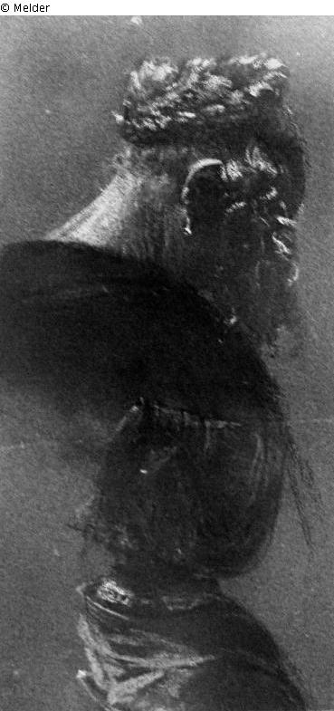 ein Kopf ohne Hut, blond, abwärts geneigt, einer seitlich mit blauem Schutenhut; auf der Rückseite Bestätigung des Neffen Prof. Krigar-Menzel