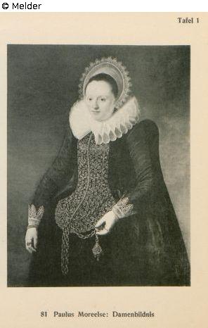 Kniestück. In schwarzem Kleid mit Goldspitzeneinsatz, Mühlsteinkragen und Spitzenhaube. Rechts oben Alter der Dargestellten und Jahreszahl 1618. S.R.