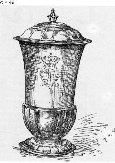 Einer von zwölf Deckelbechern. Die Becher sind jeweils über dem niedrigen Fuß zunächst bauchig getrieben und erweitern sich dann konisch geschwungen nach oben. Der Deckel ist wie der Fuß und der untere Teil des Korpus breit geriffelt. Die Deckelhandhabe hat die Gestalt einer sternenförmigen Blüte. Das Innere von Becher und Deckel ist vergoldet. Alle Stücke tragen das ernestinische Wappen unter dem Fürstenhut sowie die Jahreszahl 1723. Gezeichnet und durchnummeriert jeweils am Fuß unten.