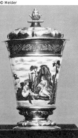 Einer von vier Deckelbechern, jeweils von konischer Form. Gewölbter Deckel mit Blattknospenknauf. Deckel, Lippenrand und Fuß mit Laub- und Bandelwerkornamentik. Auf der Wandung umlaufende Emailmalerei: Mythologische Szenen.