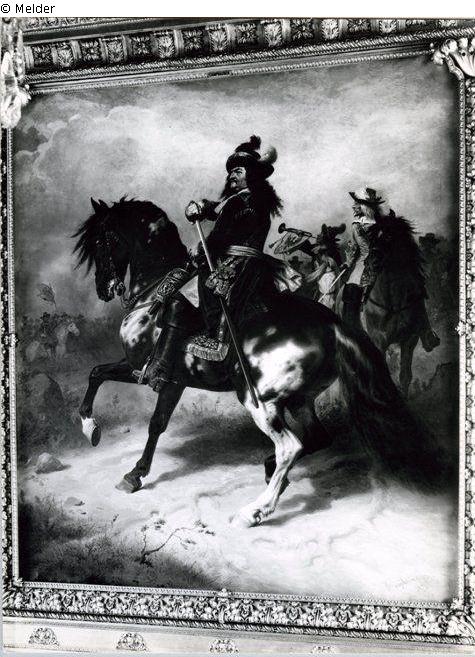 Der große Kurfürst zu Pferde am Morgen der Schlacht bei Fehrbellin, in seiner Nähe Feldmarschall Derflinger und ein Trompeter, der zum Angriff bläst.