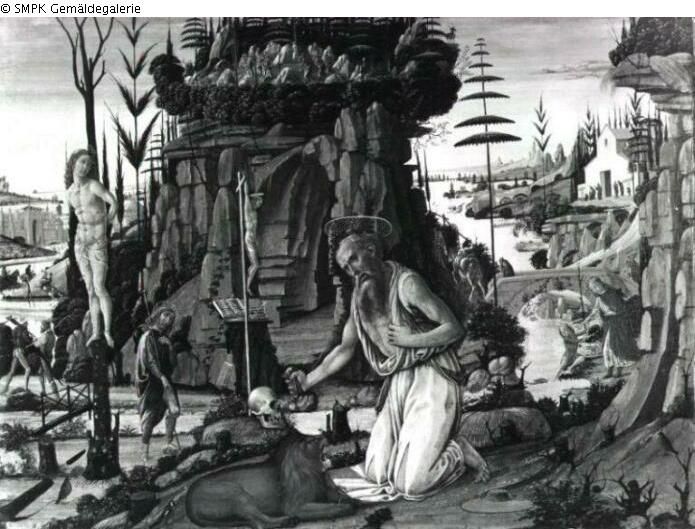 Tafelmalerei: Bild: der heilige Hieronymus als Büßer in der Wüste kniet halbnackt vor einem Kruzifix und hält einen Stein in seiner Hand, um sich an die Brust zu schlagen; ein Totenschädel (und andere Vanitas-Symbole), manchmal ein Skorpion und eine Schlange, befinden sich neben ihm & der heilige Sebastian ist von Pfeilen durchbohrt; die Bogenschützen sind sichtbar & Rochus (Roch) von Montpellier, Bekenner und Pilger; mögliche Attribute: Engel (mit Salbgefäß oder Löffel), Hund (manchmal mit Brotlaib), (Fingerzeig auf) Pestbeule auf dem Schenkel, Pilgermuschel, -stab, -hut, und -tasche; Wüste; Buße; knien; Kruzifix; Stein; schlagen; Totenschädel; Skorpion; Schlange; Eitelkeit; Vanitas; Selbstzüchtigung; Brust & Bogenschütze & Rochus (Heiliger); Arzt; Bekenner; Pilger; Engel; Salbe; Dose; Löffel; Hund; Laib; Pestseuche; Schenkel; Pilgerstab; Pilgertasche; Muschel (des Pilgers); Beule; Pilgerhut