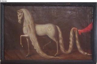 Kopie nach diesem zugeschriebenem Original. Ein Pferdeporträt; der Oldenburger namens Kranich, das Lieblingspferd von Graf Anton Günther von Oldenburg (* 1583, † 1667), ist nach links schreitend, vor dunklem Hintergrund frontal von der Seite gesehen, die lange Mähne des Schimmels schleift auf dem Boden, ein von rechts in den Bildraum reichender, in einen roten Ärmel gekleideter Arm hält den meterlange Schweif des Tieres. Den hinteren Schenkel des Pferdes ziert eine großes „A“ in einem Blätterkranz.