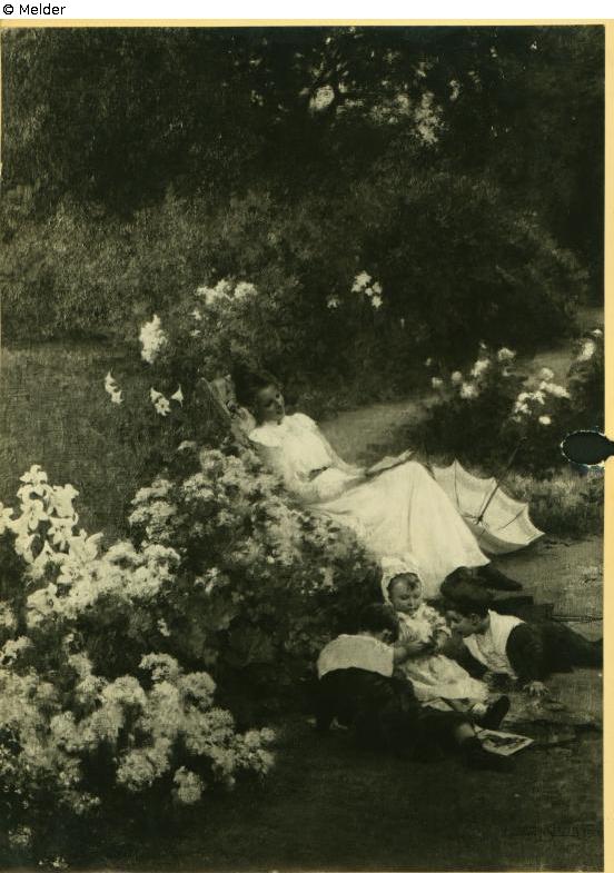 Tafelmalerei: Bild: Park & Kinderspiele in der Natur & auf einer Erhebung sitzen (weibliche Figur) & lesen & Blumen & Sonnenschirm