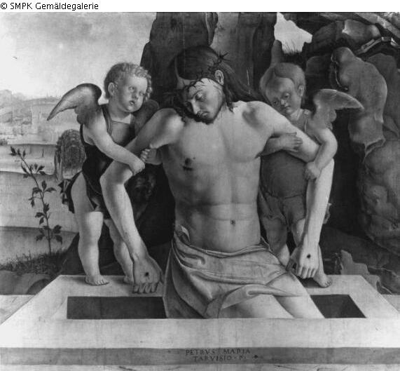 Tafelmalerei: Bild: Grablegung Christi (möglicherweise durch Engel) & der Schmerzensmann wird von trauernden Engeln gestützt oder begleitet (Engelpietà); Grab; Höhle; Engel; Begräbnis & Engel; trauern; Engelpietà; Bez. unten in der Mitte; Signatur: PETRVS ARIA/TARVISIO .P.; Maße: 57 x 64 cm