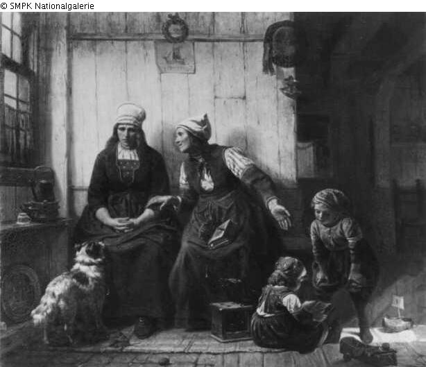 Tafelmalerei: Bild: Witwe : Mutter und Kind(er), Frau und Kind(er) (Familiengruppe) & Kondolenz, Beileidsbezeugung & Tröstung & Gemeinschaftsräume (im Inneren des Hauses) & Junge (Kind zwischen Kleinkindalter und Jugend) & Mädchen (Kind zwischen Kleinkindalter und Jugend) & (Spiele mit) Spielzeug & geöffnetes Buch & Hund & Kaffeekanne & Bild im Bild : Segelschiff, Segelboot