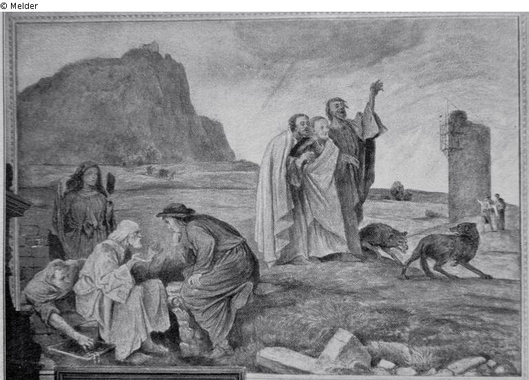 Eine Folge von fünf Bildern nach den Wandgemälden in der Aula des Kaiser Friedrich Gymnasiums in Frankfurt/Main: Lukas 14,28 "Wer bauen will und sitzt nicht zuvor und überschlägt die Kosten, ob er´s habe auszuführen." - Aus der Ebene ragt links hinten auf hohem Fels ein Haus zum grauen Himmel. Rechts wird an einem Turm gebaut und daneben bespricht der Bauherr mit dem Baumeister den Plan. Dann folgt im Mittelgrund eine Gruppe der falschen Propheten und vorn bietet ein Greis dem aufhorchenden Schüler falsche Wahrheiten an. Ein altes Weib, die Eitelkeit, steht dabei und ein Dieb nützt die Gelegenheit, r.u. Monogramm des Künstlers. Maßangabe (wohl Breite) auch 65,5cm. Die Abbildung zeigt das erwähnte Wandgemälde, das als Vorlage diente. Gemalt 1903.