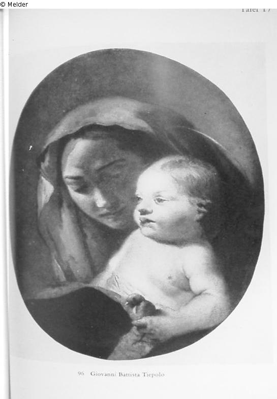 Die heilige Anna in hellgrauem Kopftuch neigt sich zu der blonden, blauäugigen Maria, die sie auf den Armen hält. Das Kind ist mit einem leuchtend blauen Mantel bekleidet und hält einen Vogel in der linken Hand. Hellblauer Hintergrund. Goldener Rahmen. Gutachten: Alexandre Benois, Marius Paulme, Voß ("...charakteristische eigenständige Schöpfung des G.B. Tiepolo aus der reifen Zeit seines Schaffens...Einfachheit der Erfindung und Kühnheit der Kontrastwirkung vereinigen sich mit dem unvergleichlichen Zauber der Tierpolesken Palette zu einem Werke von seltener Geschlossenheit und Stärke des Eindruckes.") 24.10.28. Aus venezianischem Besitz.