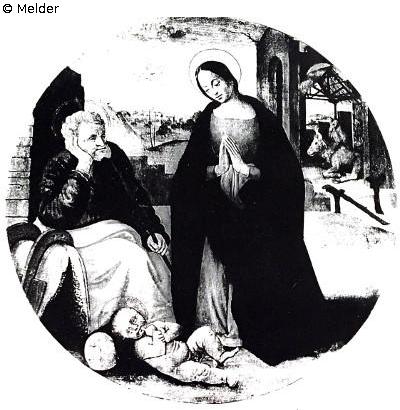 Die heilige Familie (Jungfrau Maria und hl. Josef) beten das liegende Christuskind an, im Hintergrund sind ein liegender Ochse und ein Esel, überdacht, zu sehen; ein großformatiges Tondo