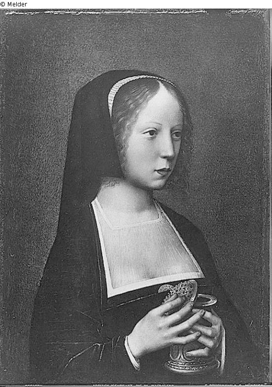 Bildbeschreibung in Karl Woermanns Galeriekatalog, Dresden 1905, S. 274, Nr. 839: "Die heil. Magdalena. Halbfigur nach rechts auf grünem Grunde. Sie trägt ein schwarzes Kleid und eine schwarze Mütze; mit beiden Händen hält sie das goldne Salbgefäss."